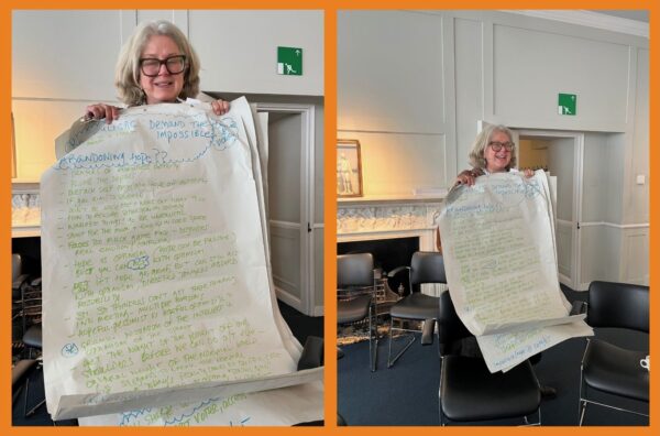 A participant holds up detailed notes from a session on 'Demanding the impossible.'